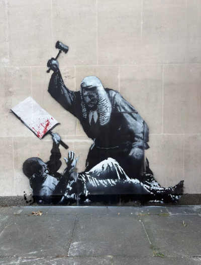 The anonymous street artist Banksy’s mural on London High Court depicts a judge striking a protester, a reference to the arrests of demonstrators for Palestine. The artwork was immediately covered by the British police.